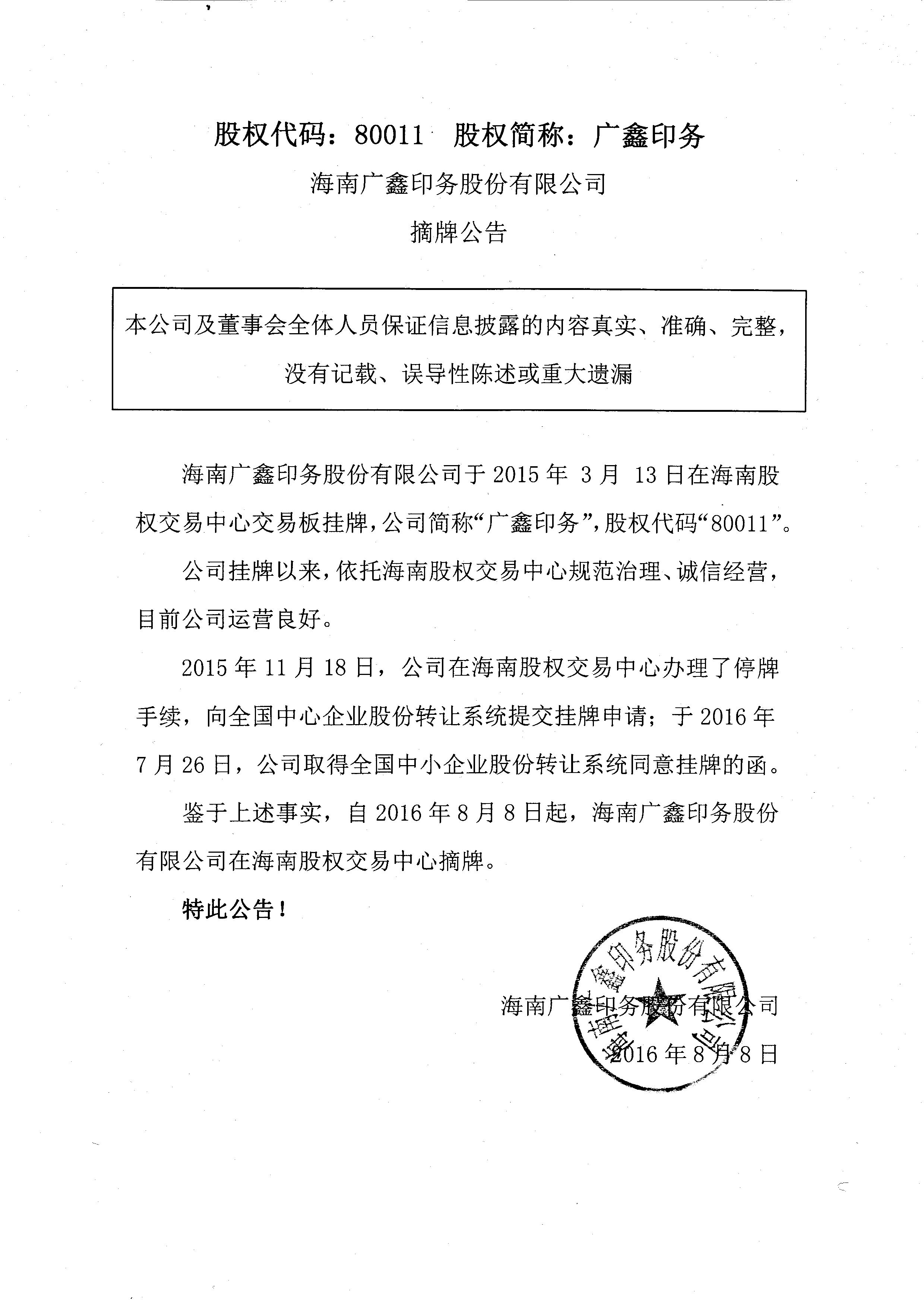 80011 廣鑫印務:海南廣鑫印務股份有限公司摘牌公告