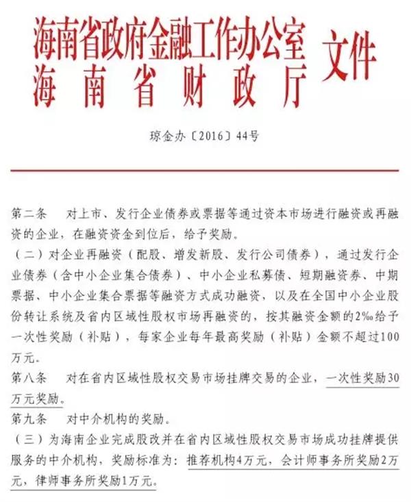 在國家采取精準有效措施大力支持中小微企業發展,解決中小微企業融資難、融資貴難題的大背景下。從2015年開始,海南省各級政府密集出臺鼓勵企業掛牌區域性股權交易市場(即四板市場)的政策。同時,在股份改制、掛牌、融資等方面,給予掛牌企業財政獎勵,以實際行動助力中小微企業對接資本市場,做大做強。
