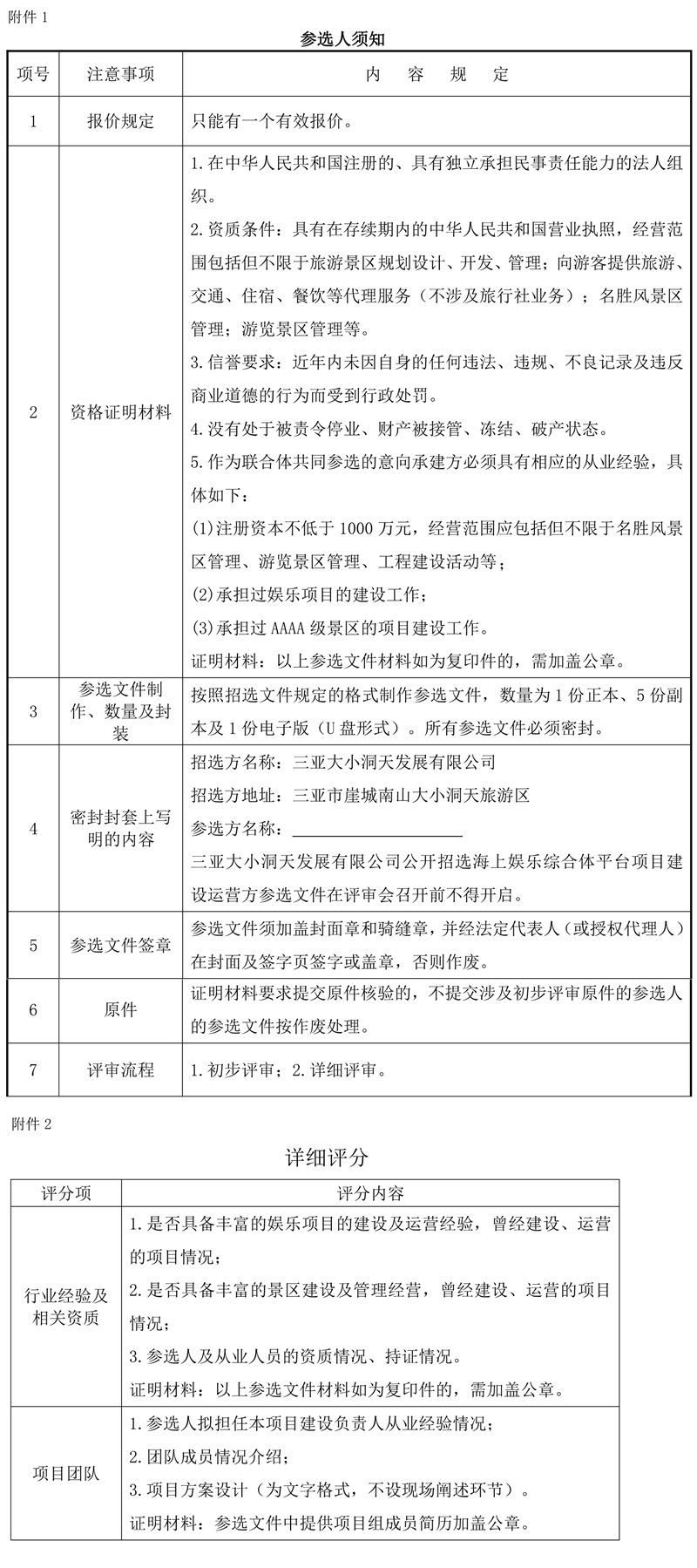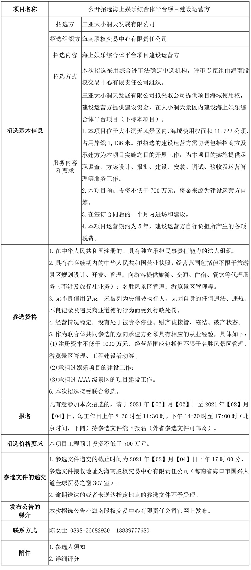 根據(jù)相關(guān)法律法規(guī),受委托,海南股權(quán)交易中心有限責任公司公開招選海上娛樂綜合體平臺項目建設(shè)運營方,為三亞大小洞天景區(qū)的海上娛樂綜合體平臺項目提供盡職調(diào)查、項目報批、建設(shè)、生產(chǎn)、安裝、調(diào)試、驗收及運營管理等服務工作。歡迎符合條件的機構(gòu)遵照本公告的有關(guān)規(guī)定報名參加,現(xiàn)將有關(guān)事項公告如下: