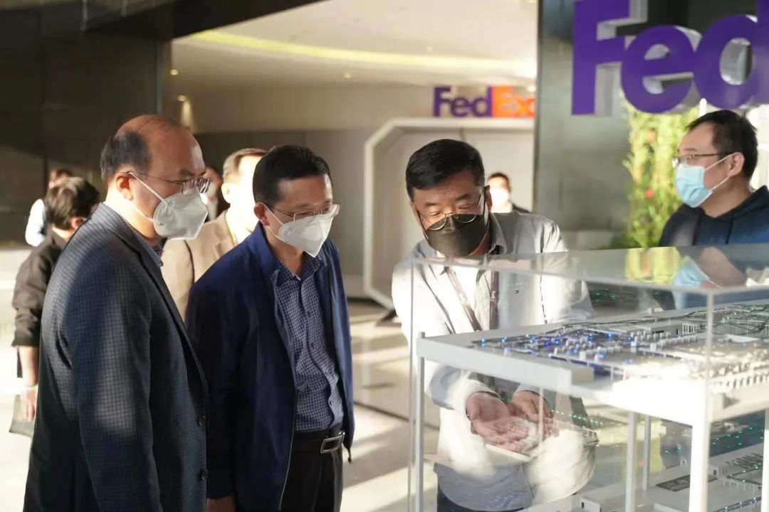 ▲圖:周軍平一行在浦東機(jī)場(chǎng)PACTL貨站參觀沙盤(pán)模型