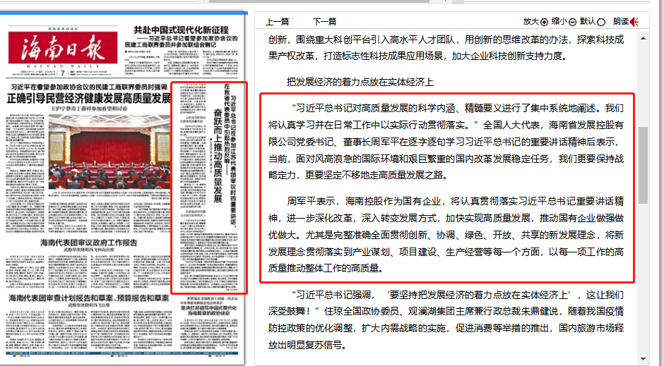 “習(xí)近平總書記對(duì)高質(zhì)量發(fā)展的科學(xué)內(nèi)涵、精髓要義進(jìn)行了集中系統(tǒng)地闡述。我們將認(rèn)真學(xué)習(xí)并在日常工作中以實(shí)際行動(dòng)貫徹落實(shí)。”全國人大代表,海南省發(fā)展控股有限公司黨委書記、董事長周軍平在逐字逐句學(xué)習(xí)習(xí)近平總書記的重要講話精神后表示,當(dāng)前,面對(duì)風(fēng)高浪急的國際環(huán)境和艱巨繁重的國內(nèi)改革發(fā)展穩(wěn)定任務(wù),我們更要保持戰(zhàn)略定力,更要堅(jiān)定不移地走高質(zhì)量發(fā)展之路。