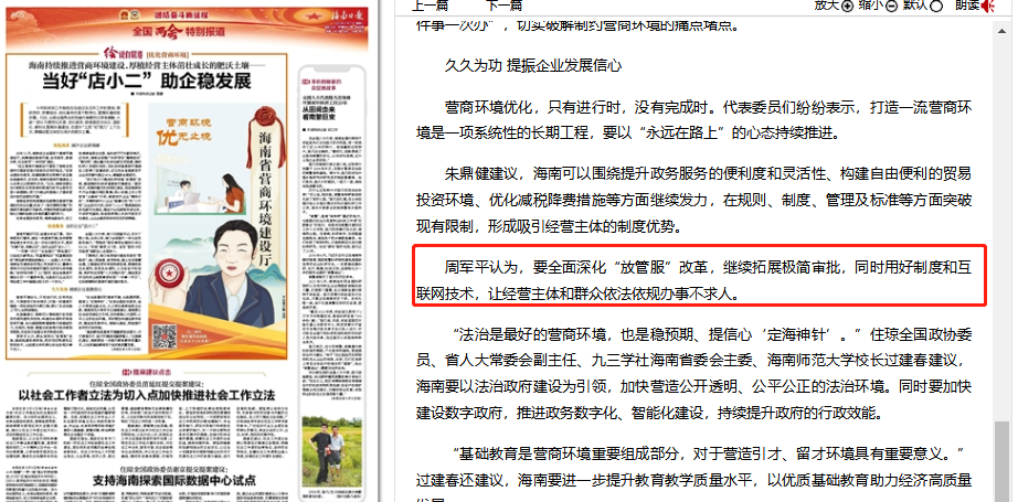 3月7日,海南日?qǐng)?bào)發(fā)布文章《當(dāng)好“店小二”助企穩(wěn)發(fā)展—— 海南持續(xù)推進(jìn)營商環(huán)境建設(shè),厚植經(jīng)營主體茁壯成長的肥沃土壤》。文章指出:今年的政府工作報(bào)告在總結(jié)過去五年工作時(shí)提到,簡(jiǎn)政放權(quán)、放管結(jié)合、優(yōu)化服務(wù)改革不斷深化,營商環(huán)境明顯改善。對(duì)此,出席全國兩會(huì)的我省代表委員們深有感觸。