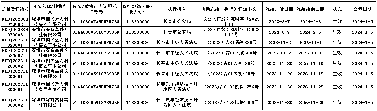 依據(jù)長春市公安局《協(xié)助凍結(jié)財產(chǎn)通知書》[長公(直經(jīng))凍財字〔2023〕11號)]、長春市人民法院《協(xié)助執(zhí)行通知書》[(2023)吉01民初388號]及長春汽車經(jīng)濟(jì)技術(shù)開發(fā)區(qū)人民法院[(2023)吉0192執(zhí)保1256號]等文件,我中心為海口聯(lián)合農(nóng)村商業(yè)銀行股份有限公司(企業(yè)代碼:893529)股東深圳市國民運力科技集團(tuán)有限公司、深圳市深商高科實業(yè)有限公司辦理股權(quán)凍結(jié)/股權(quán)輪候凍結(jié)登記,具體情況如下: