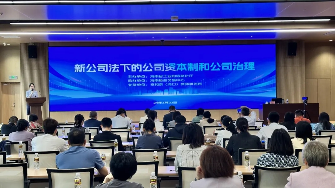 3月22日上午,由海南省工信廳主辦、海南股權交易中心承辦的“新《公司法》下的公司資本制和公司治理”專題培訓在海口舉辦。本次培訓旨在幫助我省中小企業掌握新公司法在公司資本制和公司治理方面的具體內容和操作要點,提升公司治理水平,推動企業高質量發展。